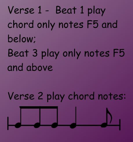 Verse 1 - on beat one of each measure play the notes in the chord, but only notes F5 and below. On beat 3 play only notes F5 and above.