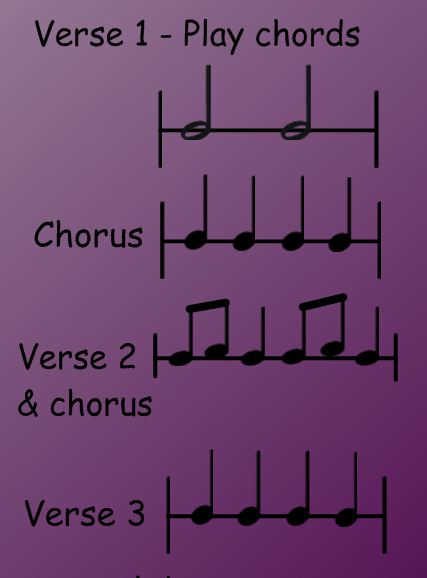 2. Play the notes for chords shown in chord symbols (ringers may require the chord notes marked on the music) with varying rhythms from verse to verse.